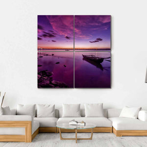 Experience the tranquil beauty of Bali with this canvas wall art featuring a serene beach scene after sunset. A boat gently rests on the water, framed by rocky shores and dramatic clouds painted in hues of purple and pink.
