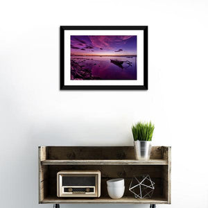 Capture the serene beauty of Bali with this stunning panoramic canvas. Featuring a lone canoe, calm water, and a vibrant sunset palette of purple, orange, and pink, this artwork brings a tranquil atmosphere to any space.