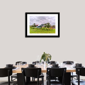 Ballistic Missile Canvas Wall Art presents a weathered airplane wreckage with a red missile still attached, set among palm trees beneath an overcast sky. Rendered photo-realistically in green, gray, red, blue, and white tones, it carries a forgotten, weathered mood and suits modern wall decor.