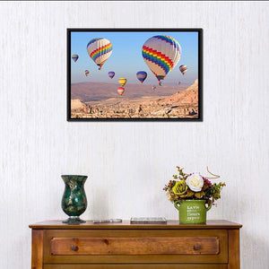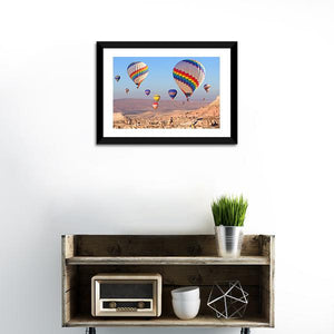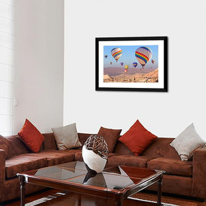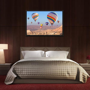 Rainbow-colored hot air balloons and mountains create an adventurous, scenic scene over Cappadocia. The vibrant, realistic canvas emphasizes depth and perspective with blue, orange and earthy tones, making it a strong choice for modern home spaces or a living room.