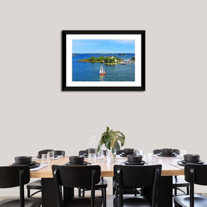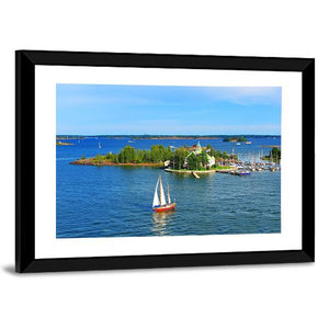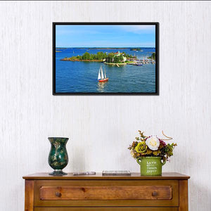 A realistic panoramic canvas of the Baltic Sea in Helsinki, Finland, showing a green island, numerous docked boats and a red-hulled sailboat. A bright blue-green palette and clear daytime light create a peaceful, serene mood that works well in coastal or modern interiors.
