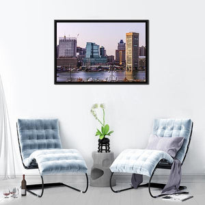 A panoramic, photorealistic view of Baltimore’s city skyline and harbor rendered in calm blues, grays and soft purples. The wide composition highlights waterfront buildings and boats, suited to modern living rooms or office spaces.
