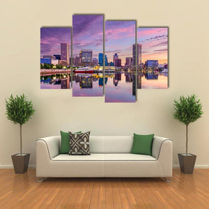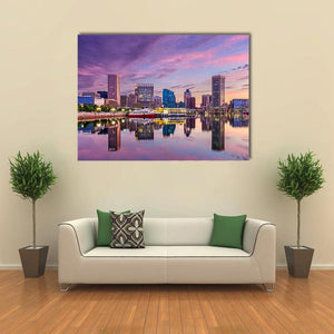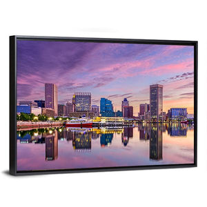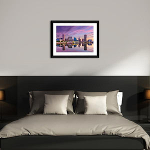 This canvas art captures a stunning city skyline with tall buildings against a vibrant twilight sky. The serene reflection on the waterfront enhances its modern appeal, making it a beautiful addition to any wall decor.