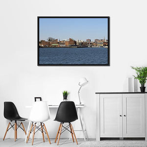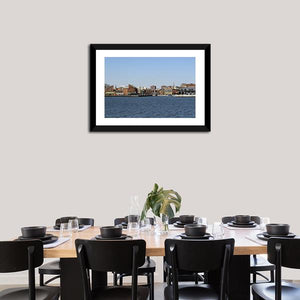 Baltimore Seascape City View Panoramic Canvas shows a calm waterfront city skyline with buildings of varying heights and a clear blue sky. Rendered in a realistic style with blue, tan, brown, white, and gray tones, it brings a serene coastal-city mood to a room. Suits modern living rooms or offices that welcome city or coastal decor.
