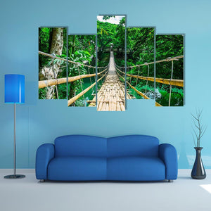 This canvas art features a realistic depiction of a suspension bridge nestled within a tropical forest. The lush greens and clear blue water evoke feelings of adventure and serenity, making it a natural fit for any space seeking a touch of the outdoors.
