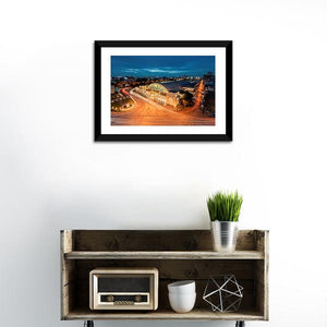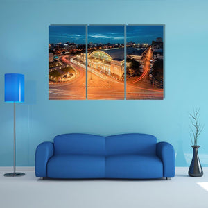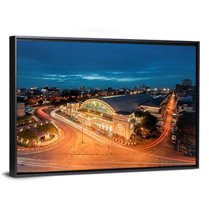This canvas captures Bangkok’s railway station from a high-angle view, showing the dome roof, glowing city lights and streaking traffic trails at twilight. The modern blue, orange and white palette and sense of motion work well in contemporary living rooms or modern offices.