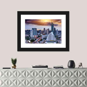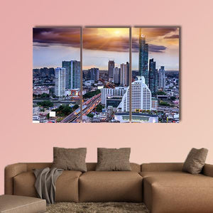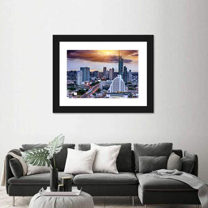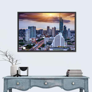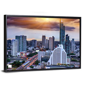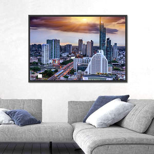 A wide, elevated view of Bangkok’s skyline where sun rays cut through storm clouds over buildings, bridges and a busy highway. The scene feels both dramatic and serene, with blue, gray and gold tones and a distinctive white building with a curved facade. A modern cityscape print that fits contemporary living rooms or offices with an urban, moody look.
