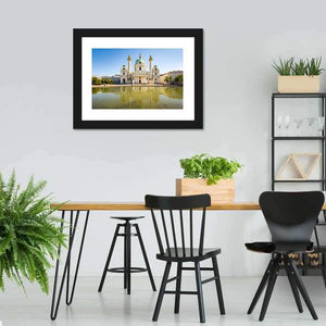 A photorealistic view of Karlskirche in Vienna, centered on its domes and columns with a clear reflection in the water. The blue, white, green and yellow palette gives the scene a serene, majestic mood. This canvas pairs well with modern living rooms or entryways looking for architectural, cityscape imagery.