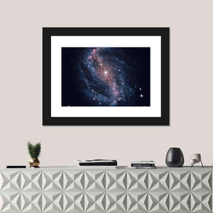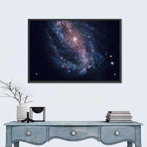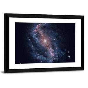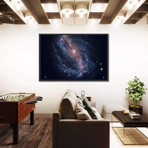 This artwork features a stunning depiction of the NGC 6217 galaxy, showcasing spiral arms and glowing pink nebulae against a deep blue backdrop. Its cosmic scene evokes feelings of awe and wonder, making it a beautiful fit for any nature-inspired décor.
