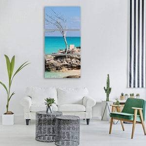 A lone bare tree stands on a rocky outcrop beside calm turquoise Caribbean water, rendered in blue, tan, brown, and white tones for a serene, isolated feeling. This coastal landscape print suits nature-inspired or modern rooms looking for a peaceful, coastal touch.