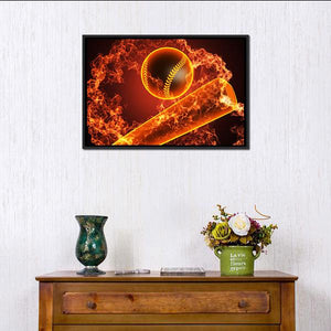This striking canvas art captures the intense energy of baseball amidst swirling flames. The dynamic composition and vibrant colors of orange, yellow, and red evoke a sense of passion and excitement, making it an eye-catching piece for any sports lover.