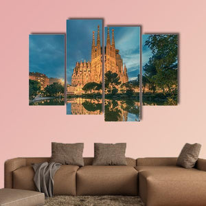 Sagrada Familia Church appears illuminated under a twilight sky, its architecture mirrored on a calm water surface. The symmetrical cityscape, rendered in golden, blue, green and brown tones, creates a majestic, serene mood that suits modern and travel-themed room decor.