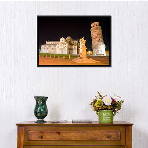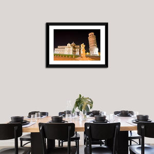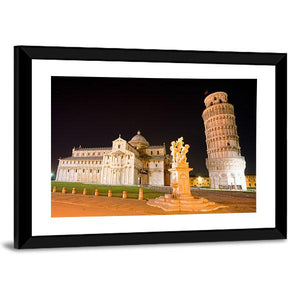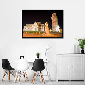 A photorealistic night view of the Leaning Tower of Pisa, Pisa Cathedral and a stone fountain with sculptures. The wide-angle perspective captures buildings illuminated at night and the tower’s slight tilt, giving the scene a historic, iconic mood. Suited to modern or classic interiors as cityscape wall art.