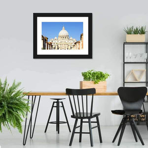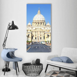 A photographic view of St. Peter's Basilica in Rome, centered on the dome and framed by classical columns under a clear blue sky. The bright blue, white, yellow, and gray palette captures a grand, iconic daytime street scene with cars and people, making it a natural fit for modern living rooms, hallways, or offices.