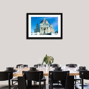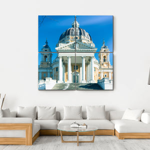 This canvas features the stunning Basilica of Superga, a grand domed church characterized by its majestic columns. With a striking palette of blue, white, and accents of yellow and grey, the artwork captures a serene winter scene underneath a bright blue sky, making it a beautiful addition to your wall decor.
