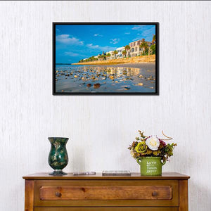 A photographic canvas of a Charleston waterfront beach, with shells on wet sand, shallow reflections and a clear blue sky. The scene reads serene and bright with palm trees, distant buildings and soft blue, tan and gray tones. Suited to coastal or modern living rooms and entryways.