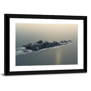 A panoramic, three-panel photorealistic print of an aircraft carrier cutting a calm ocean, seen from an aerial perspective. Blues, greys, and tans give the scene a calm, imposing, and vast atmosphere. Suited to modern, military, or maritime-inspired rooms as a strong focal piece.