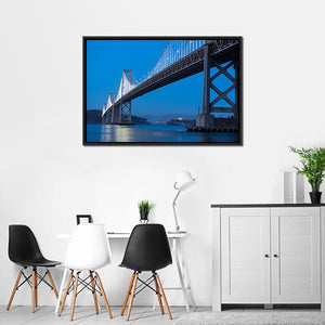 Experience the serene beauty of the iconic Bay Bridge as twilight descends. This photorealistic artwork captures the majestic structure illuminated by soft suspension lights against a backdrop of tranquil blue and grey skies, reflecting on the peaceful water below.