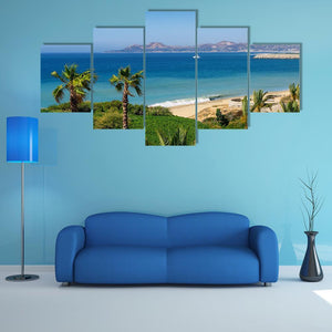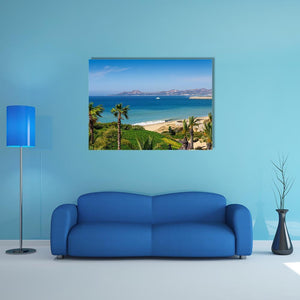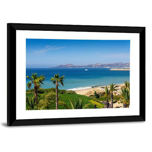 A realistic landscape of a Mexican coastline featuring a sandy beach, palm trees, hills and a small boat on clear blue water. Daytime light and a blue-green-tan palette create a calm, tropical mood. Fits modern coastal or living-room decor and room-focused spaces.