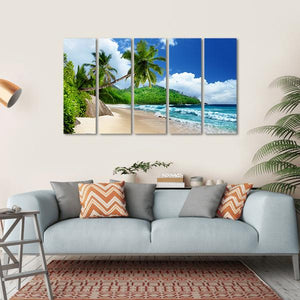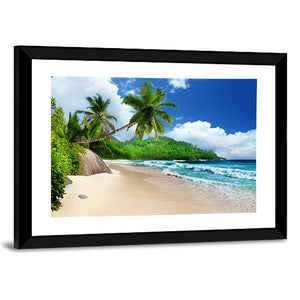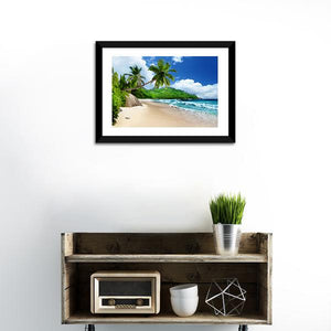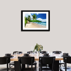 Bring the tranquil beauty of Mahe Island into your home with this canvas wall art. Featuring a tropical beach scene with palm trees, ocean waves, and lush green hills, it evokes a serene and peaceful atmosphere.