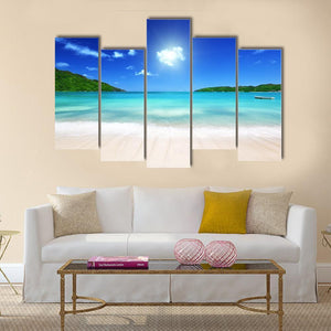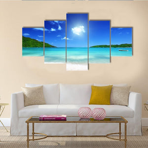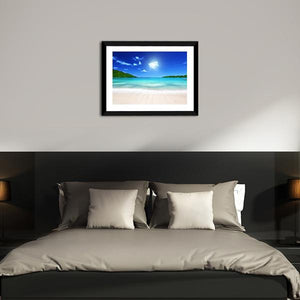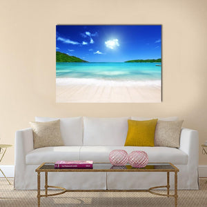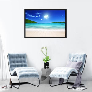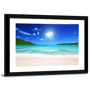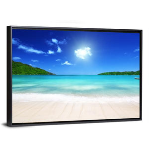 This canvas wall art captures the serene beauty of a tropical beach at Praslin Island, showcasing gentle waves and pristine white sand. The vibrant palette of blue and turquoise invites tranquility into any space.