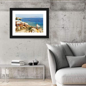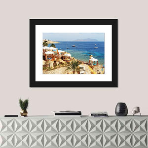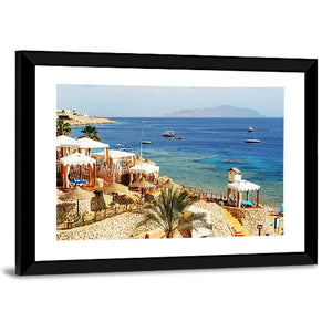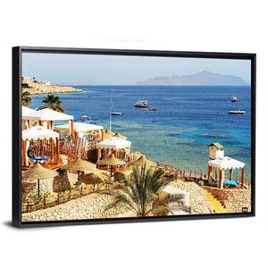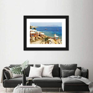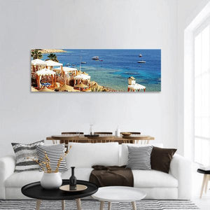 Photo-realistic canvas of a beach resort showing thatched cabanas, clear turquoise water, scattered boats and a rocky coastline. The tropical scene brings a calm seaside mood and suits coastal or modern room decor.