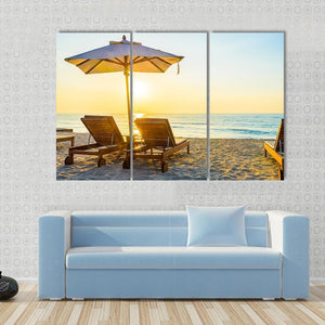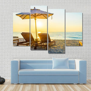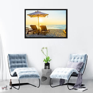 Experience serenity with this captivating beach scene. Featuring two wooden lounge chairs and a large white umbrella, it evokes a peaceful sunset by the ocean. Ideal for creating a relaxing atmosphere in your home.