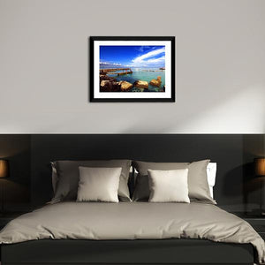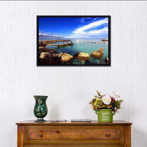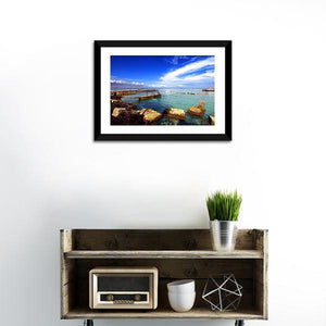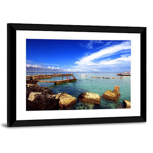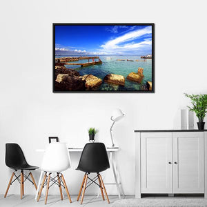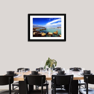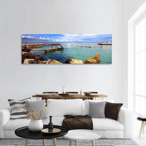 Beach In Goree Island Panoramic Canvas presents a peaceful, sunny seaside scene with a pier, boats, and rocky shoreline. Rendered realistically in blues, greens and warm browns, the panoramic view brings calm coastal character to living rooms and modern nature-focused spaces.