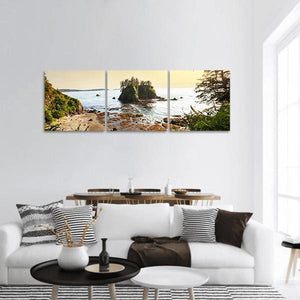 A panoramic canvas showing a Washington beach with a coastal island, rocky shoreline, ocean and trees, rendered in a realistic style. Soft greens, blues and greys with sunlight on the water and wet, vegetation-lined rocks create a serene, natural mood that suits modern or coastal-themed rooms.
