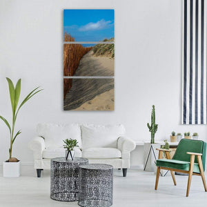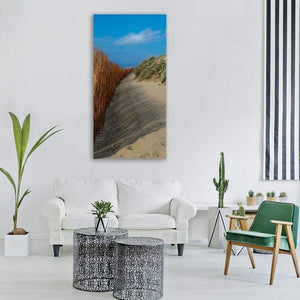 Landscape Of Costa Marbella captures a sandy path through dune grasses beneath a blue sky. A bamboo fence and its shadows create leading lines and foreground interest, giving the print a serene, natural feel that works well in coastal or nature-inspired rooms.