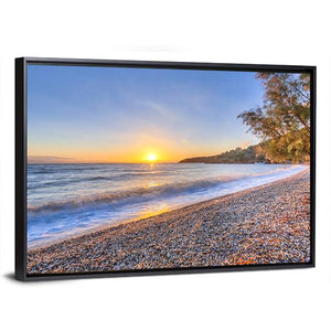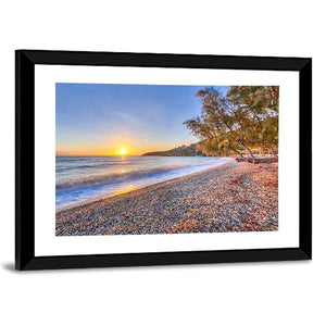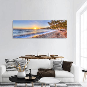 A serene panoramic seascape featuring a tamarisk tree on a pebble beach at sunset. The photorealistic print highlights long-exposure water, soft blues and warm oranges, and suits modern coastal or minimalist rooms.