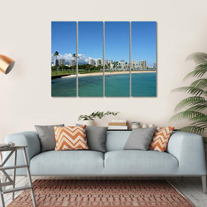 Bring the serene beauty of Oahu to your space with this stunning beach scene. Featuring a calming palette of blue and tan, it captures the essence of a tropical day marked by a clear sky and peaceful turquoise waters.