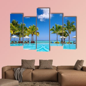 This photorealistic canvas shows a Mauritius beach resort with a swimming pool, palm trees and umbrellas, and the ocean and sky beyond. Its tropical blue-green palette creates a calm, daytime mood and suits coastal or modern room decor such as living rooms and bedrooms.