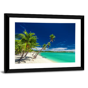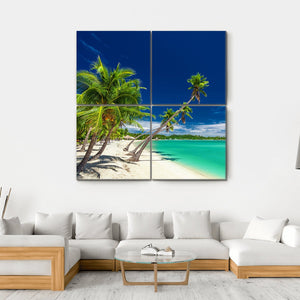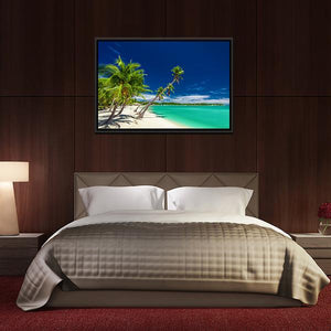 Bring a tropical vibe to your space with this stunning canvas featuring a serene beach scene. Leaning coconut palm trees sway against a clear blue sky, inviting you to escape to a vibrant oasis by the ocean.