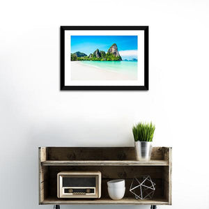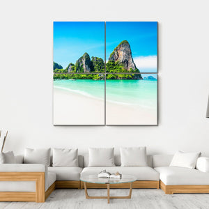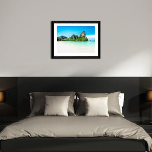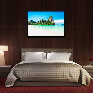 This canvas print captures a serene tropical beach scene with limestone karsts and a sparkling ocean. The combination of clear turquoise waters and lush green vegetation creates an idyllic atmosphere that brings the beauty of nature indoors.