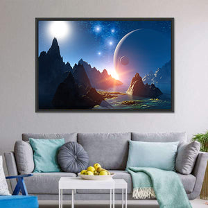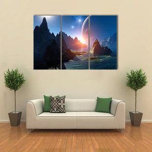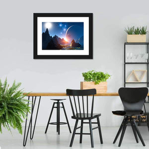 This 3D fantasy landscape shows an alien planet with mountains, water and a large celestial body beneath a starry sky. Rule-of-thirds composition and dramatic lighting create an awe-inspiring, otherworldly yet serene mood. It suits modern interiors and contemporary room decor.
