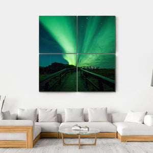 This canvas wall art captures the enchanting aurora borealis in Iceland, featuring a wooden walkway that leads to the night sky filled with stars. The vibrant green and blue hues create a magical atmosphere, perfect for adding a touch of mystery to your space.