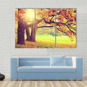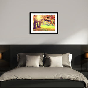 This canvas art captures a serene autumn landscape, featuring trees and a park covered in warm shades of yellow, orange, and brown. It brings a vibrant touch of nature indoors, making it a lovely addition to your home decor.
