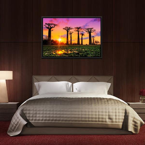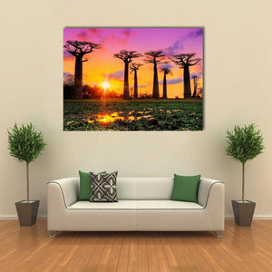 Baobab Trees At Sunset shows silhouetted baobab trees against an orange and purple sky, with sunburst highlights and reflections in water puddles across a green-brown field. The photorealistic landscape uses a rule-of-thirds composition for a serene, vibrant, natural feel that suits modern interiors and room decor.