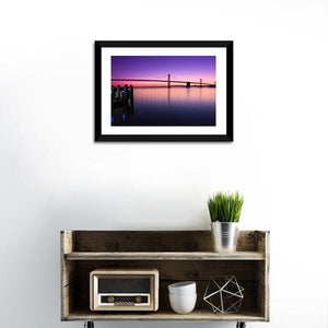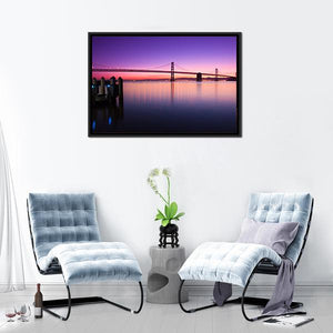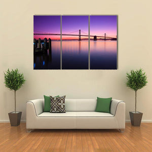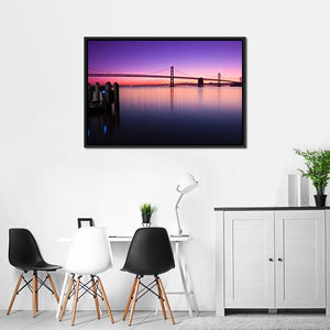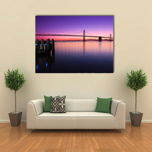 Beautiful Bay Bridge Canvas Wall Art depicts the bridge, calm water and open sky in soft sunset hues of purple, pink, blue and orange. The horizon-line composition with pier pilings and bridge lights gives a peaceful, modern feel that fits contemporary living rooms or bedrooms.