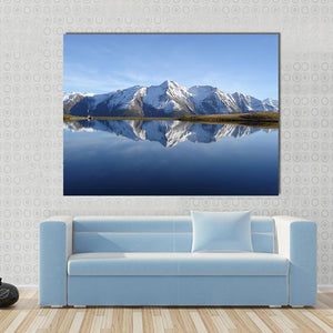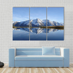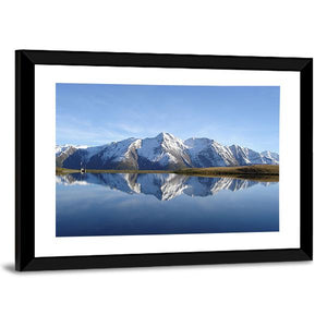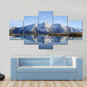 This landscape artwork captures the tranquil beauty of snow-capped mountains and a serene lake, featuring a sailboat gliding across the water. The reflection of the mountains and sky creates a majestic and calming atmosphere, perfect for enhancing your wall decor.