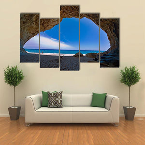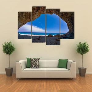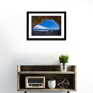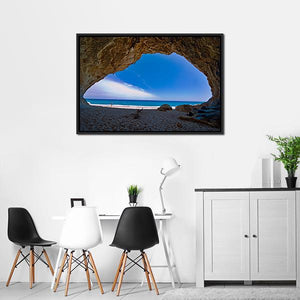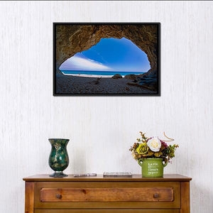 Experience the serene beauty of nature with this captivating canvas art. Featuring a tranquil cave entrance that opens up to a sandy beach and calm ocean, it's a perfect fit for any modern decor.