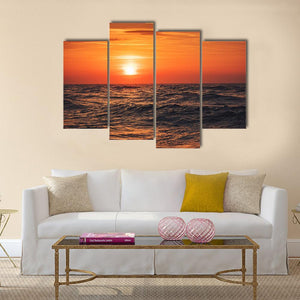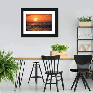 Sunrise Over Ocean Canvas Wall Art shows a warm, serene sunrise over rippling ocean water with streaky clouds and gold-tinged light. The modern landscape uses orange, red and blue tones for a quietly dramatic feel and suits modern living rooms or bedrooms.