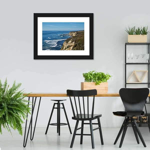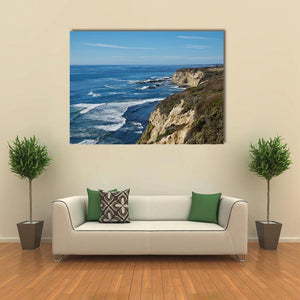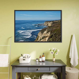 Coastal View In California Canvas captures coastal cliffs and crashing ocean waves beneath a clear blue sky. The realistic scene uses blue, tan, green, and white tones for a calm, serene atmosphere. It suits coastal and modern room decor in a home.