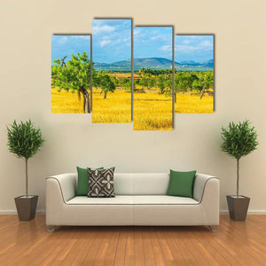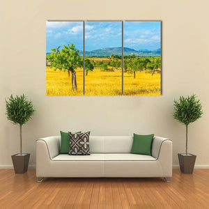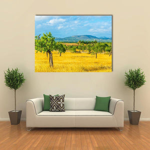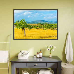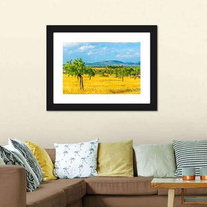 Countryside of Mallorca, Spain depicts a realistic summer landscape of golden fields, scattered trees and distant hills beneath a bright blue sky. The peaceful, serene mood and warm green-yellow palette make this nature print a calm choice for modern living rooms, bedrooms, or other room decor focused on natural scenes.