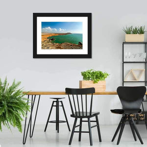 Coastline In La Guajira captures coastal cliffs, calm water, a beach and a distant mountain range in a photorealistic landscape with an expansive, serene feel. Wide-angle, high viewpoint composition and a palette of blue, green, orange, white and brown highlight textured rock formations and calm water. It suits modern or nature-inspired rooms and brings a quiet, natural presence to your wall.