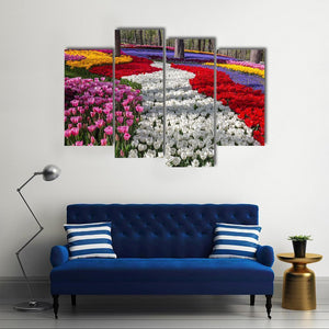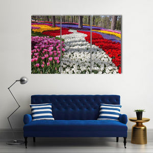 This vibrant landscape artwork features a winding garden path flanked by colorful rows of tulips and tall trees. Its cheerful tones bring a natural beauty to your space.