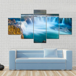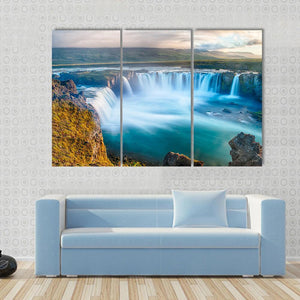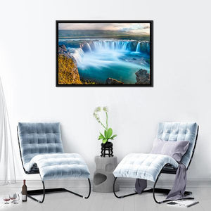 This canvas wall art beautifully captures the serene and majestic Godafoss Waterfall in Iceland. With its flowing water and striking blue and green tones, it adds a natural, modern touch to any space.