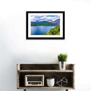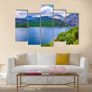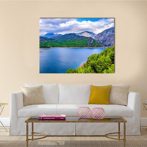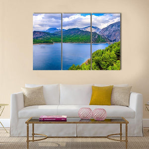 Green Canyon in Turkey shows a peaceful lakeside landscape with a clear lake, rocky mountains and pine forests under puffy clouds. The composition emphasizes depth and the rule of thirds, with a calm palette of blue, green, gray and white. Suited to modern living rooms or nature-themed spaces looking for a serene, natural scene.