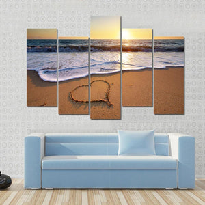 This beautiful canvas art features a serene beach scene at sunset, highlighting a heart drawn in the sand. With its calming palette of orange, blue, and tan, it brings a romantic element to your space.